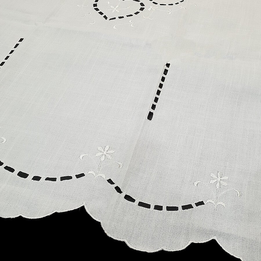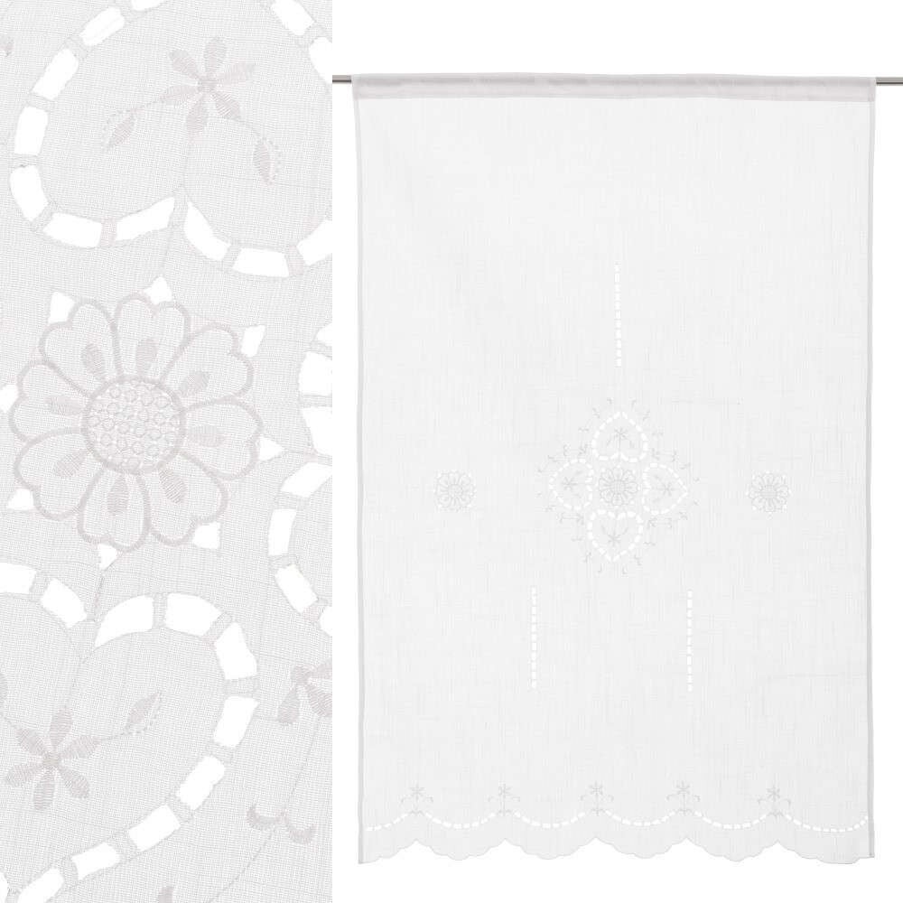 Bonitas cortinas en color blanco, de estilo tradicional, decoradas con dibujo de corazones calados y flores bordadas terminada en unas ondas