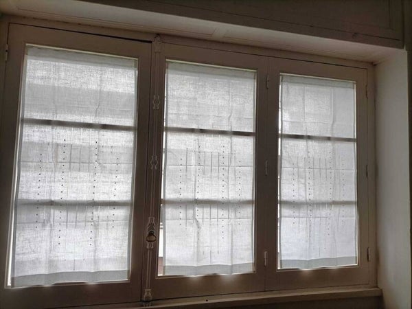 Cortinas ya confeccionadas con dobladillo para colgar con una barrita de presión dentro del cristal o poner una barra extensible pegada en el marco de la ventana.