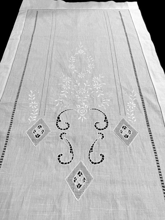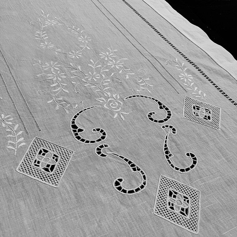 Cortinas de 100% hilo en color blanco bordadas con tradicionales vainicas y flores, terminadas en recto.